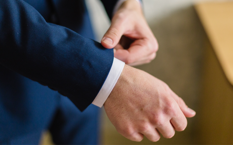 ここで見え方に敏感な人は、さりげなく袖先を調整して元のバランスの良い状態に戻します。この所作、やっていただくとわかりますがカッコ良いです。紳士服のモデルなどのお決まりのポーズでもあります。