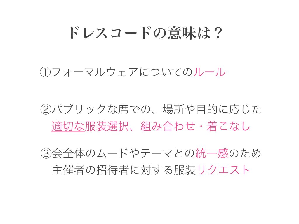 いかがでしょうか。以上のことを頭に置いておいてください。 「ドレスコード」の全体を把握するのに役立ち、「この場面はこれかな」と想像がつきやすくなります。