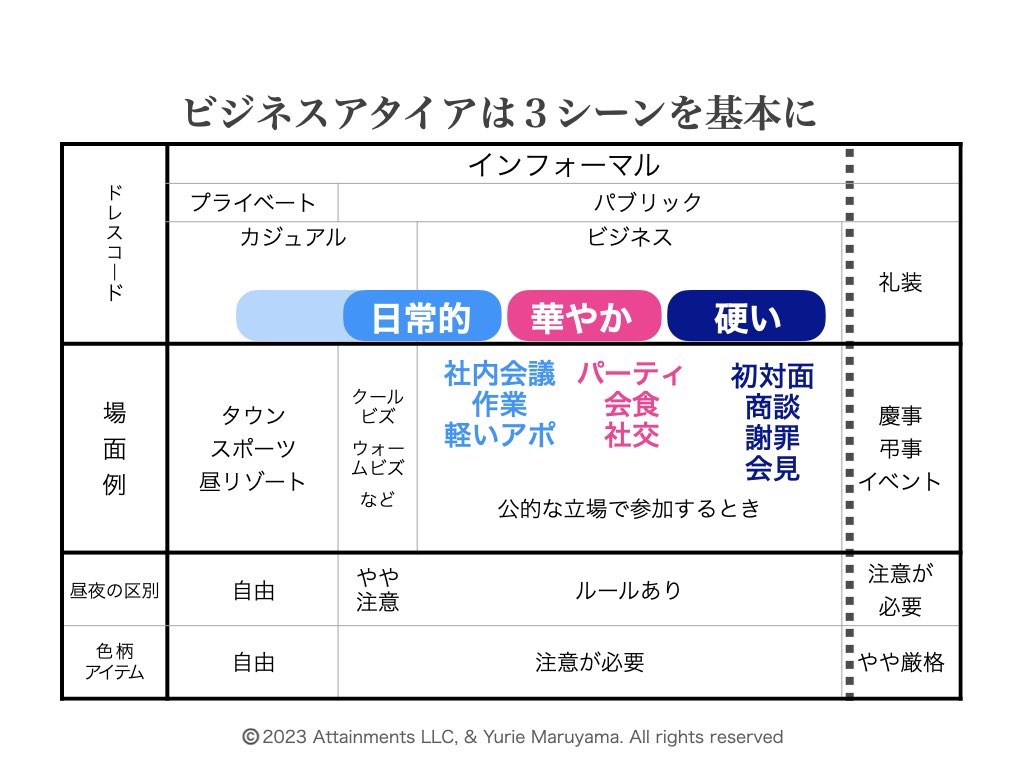 適切な装いのトーンを選ぶには3つのシーンを基準にしましょう。