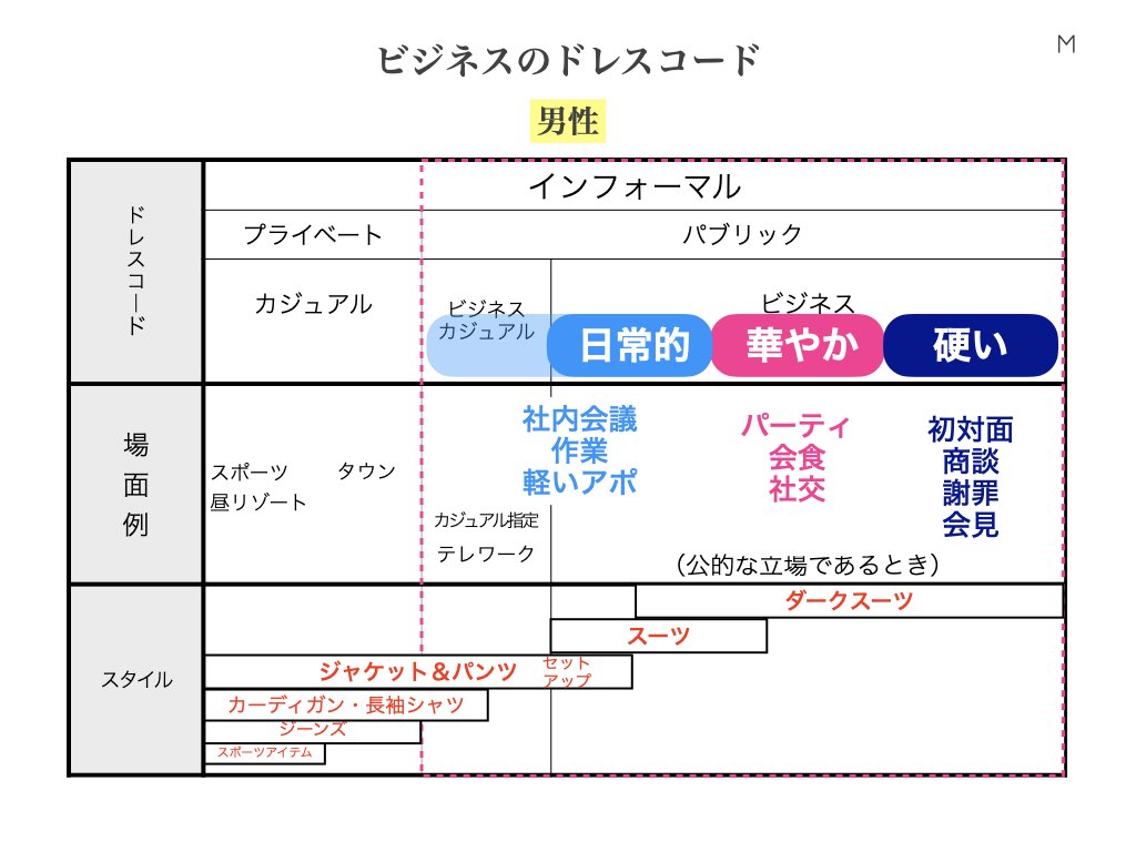 「日常的」 =社内での会議や作業など、外部の人間とあまり会わない日や、気のおけない相手との軽いアポなど。節度さえ守れば大丈夫、という感覚の場面です。