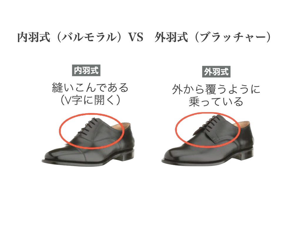 靴の「内羽式」と「外羽式」の違いは、ヒモを通す部分がどのように作られているかの違いです。