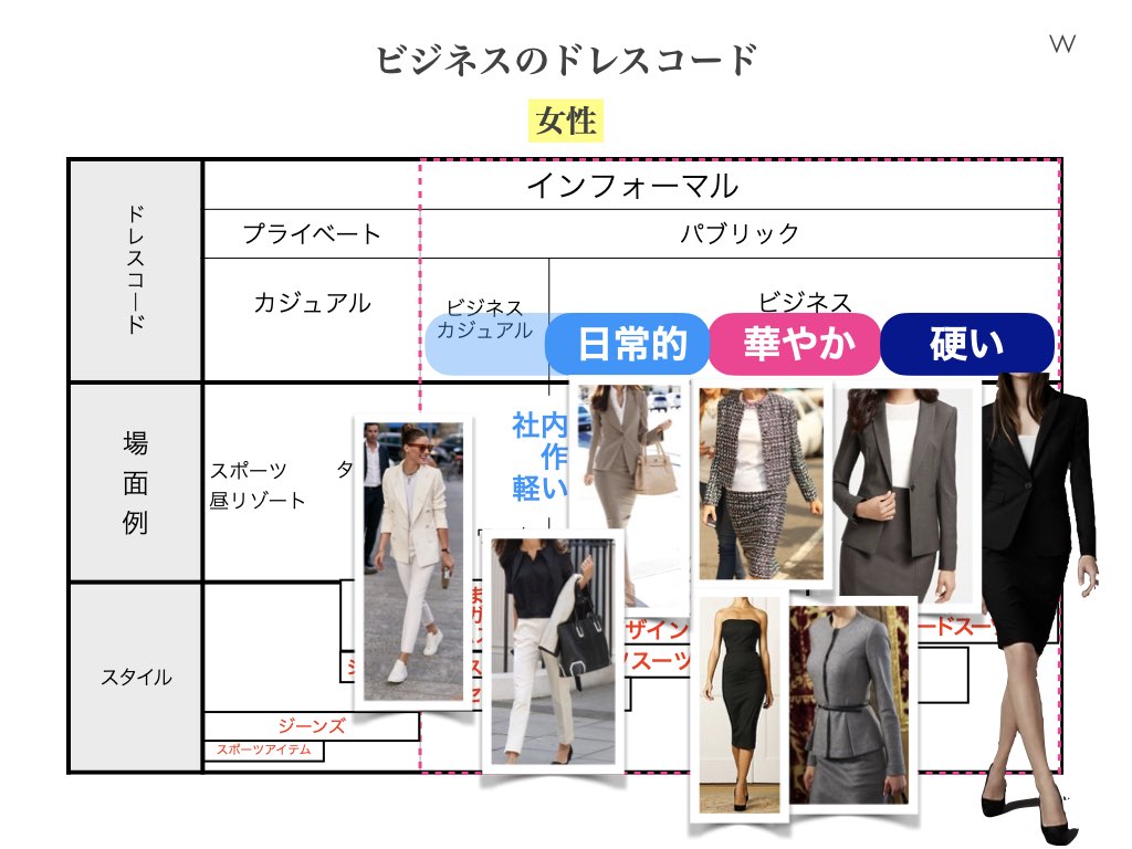 女性の場合は上で言いましたように、日常的な場面に行くに従って、男性より女性の方が選択できるスタイルやアイテムは多くなります。ただし、柔らかくカジュアルなアイテムを選べば、それだけ「権威」「格」のイメージからは遠ざかります。 そこを踏まえて自分の立場や役割に合った「あなたにふさわしい服」を選ぶのは男性より女性の方が神経を使わなければならないことを意識しておいてください。