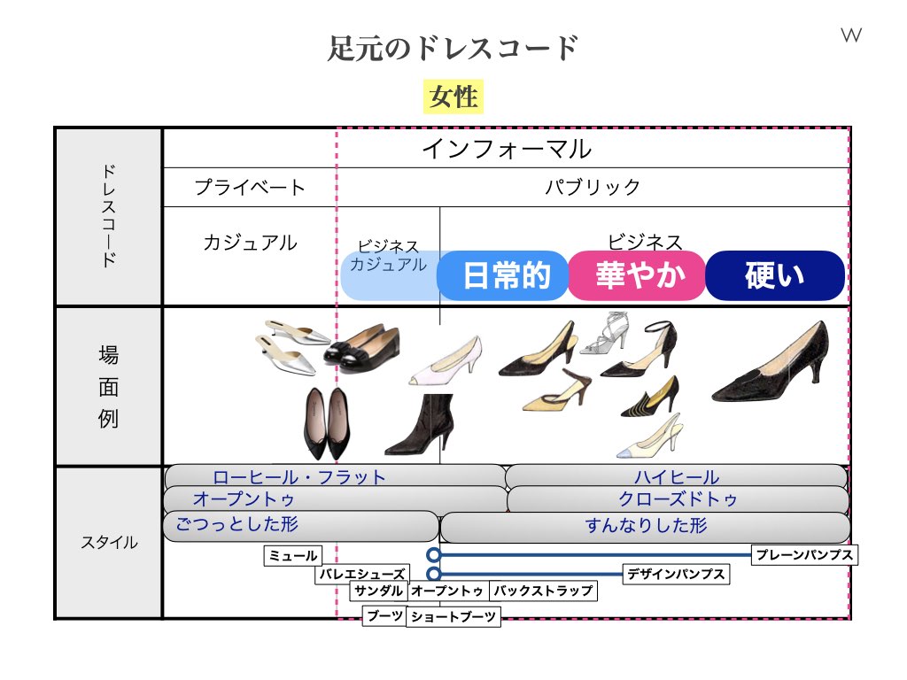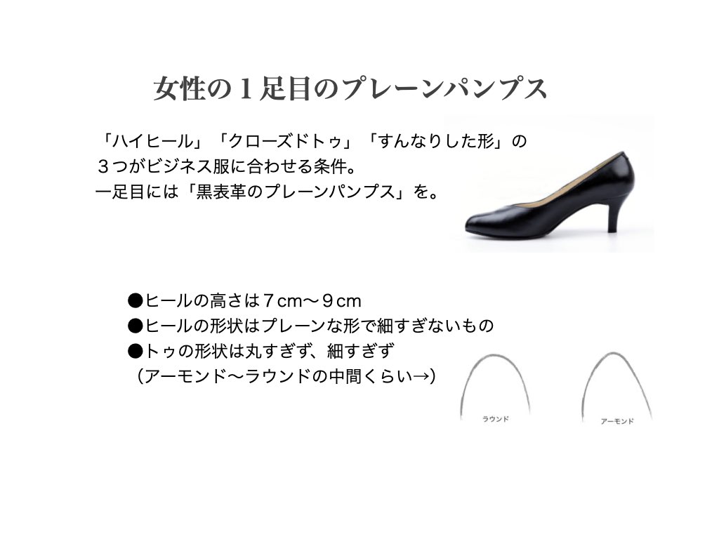 女性の場合の靴は「ハイヒール」「クローズドトゥ」「すんなりした形」の3つがビジネス服に合わせる条件です。 絶対に一足持っておきたいのは「黒表革のプレーンパンプス」です。硬い場面では必ず選びましょう。