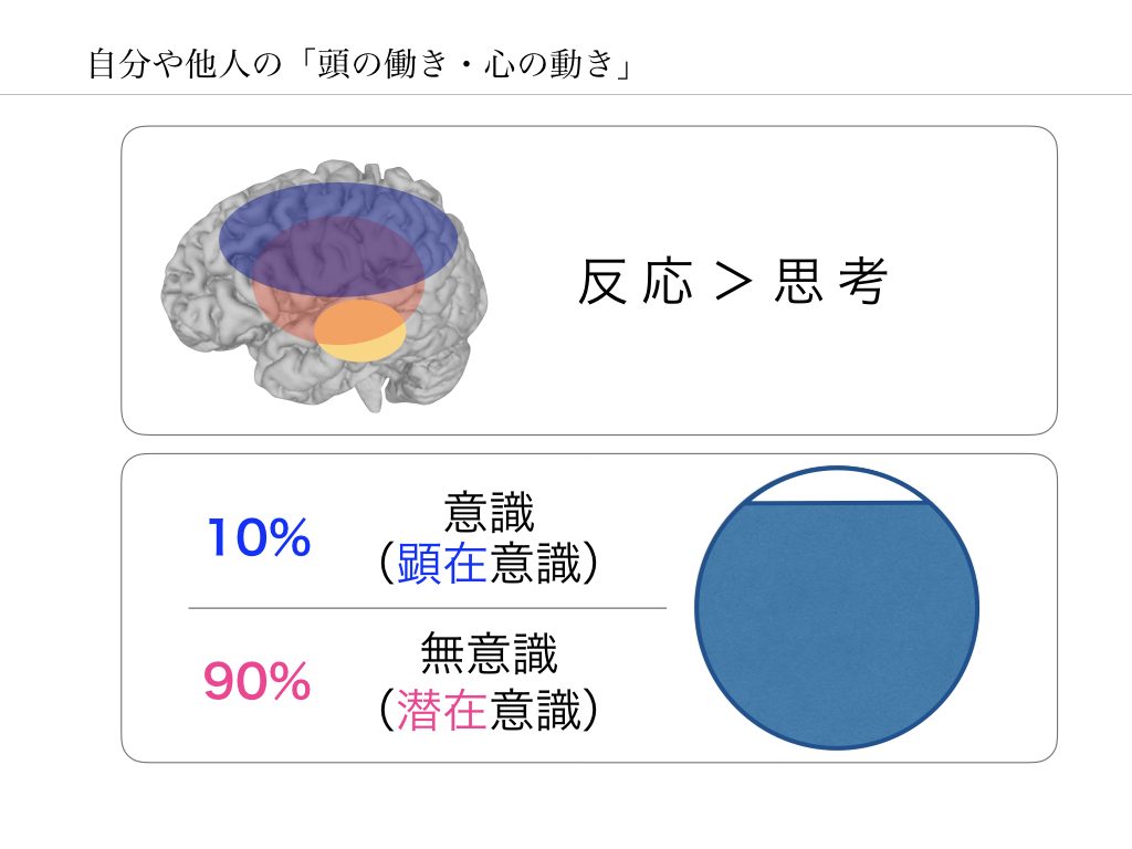 まず覚えておかなければならないのは、人は「思考」という理性的な頭の働きの前に、「反応」「感情」といった本能的で理屈によらないことが起こるということです。そして、それは私たちの意識の9割を占める領域で起こり、またそれは私たちが知覚できない領域であるとということです。