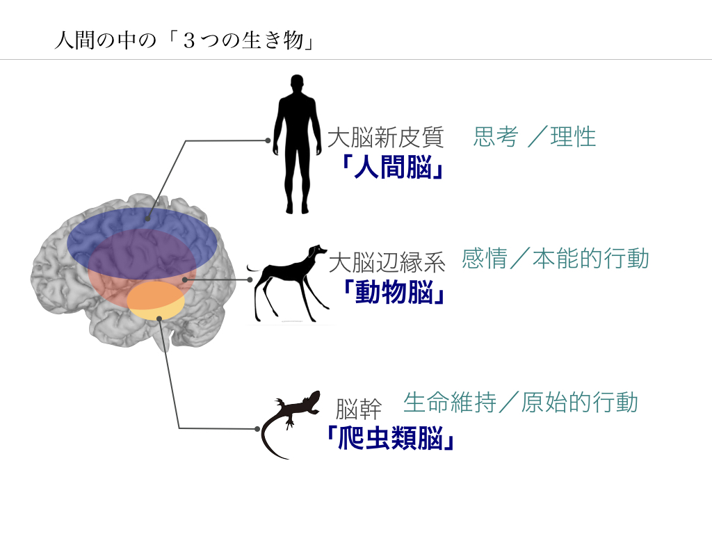 「脳の中の3つの生き物」というのは、脳の機能の分類に対する例えです。人間の脳の中には、進化の過程で発達した順で3つのエリアがあります。それを動物に例えています。