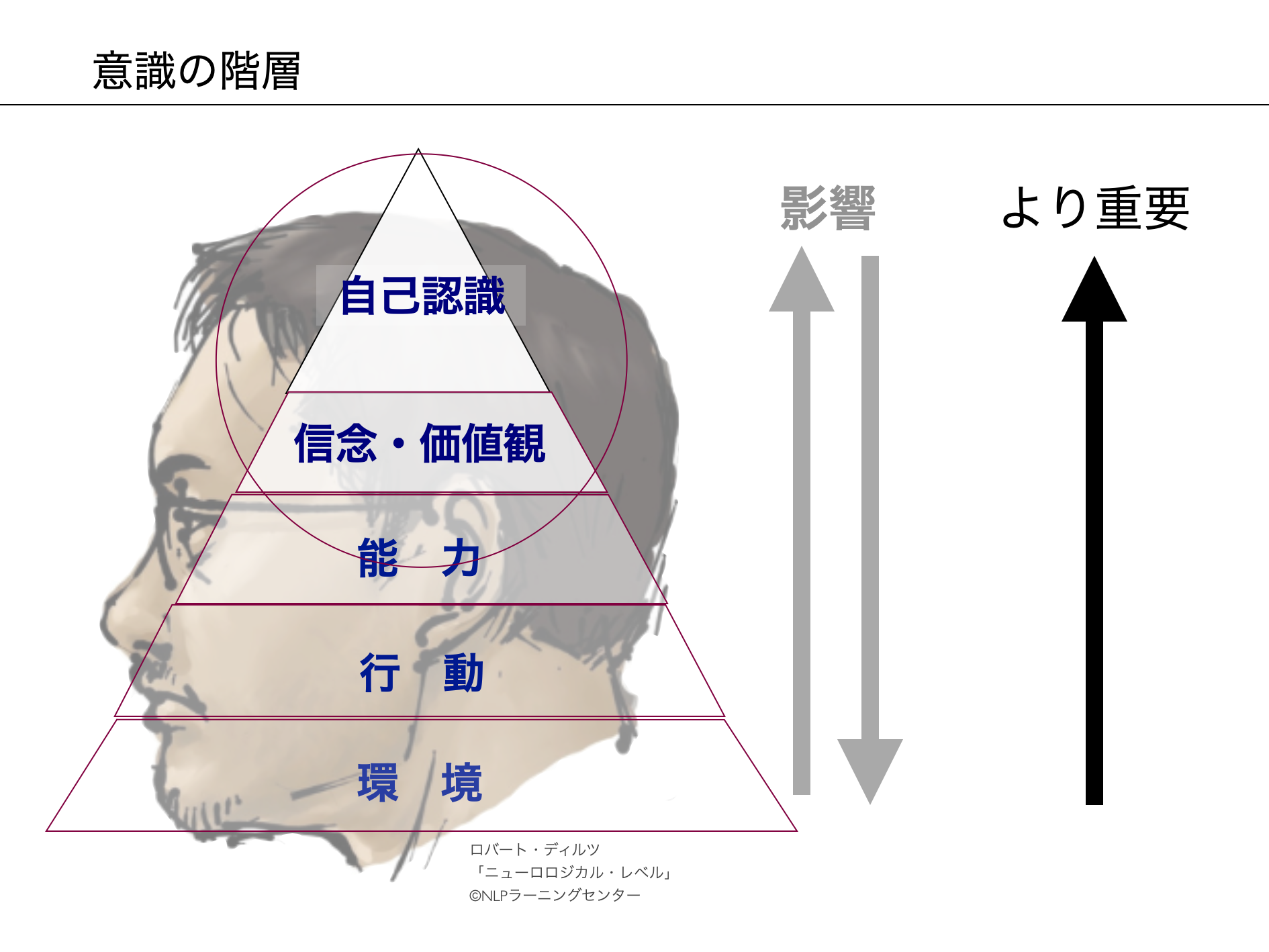 心理学の研究では、私たちがふだん使っている「意識」には「階層」があり、階層の上にあるものが下のものに影響しているとされています。これを提唱したのはアップルやIBMなどの世界的企業のコンサルタントであり行動スキルトレーナーとして有名なロバート・ディルツ氏です。