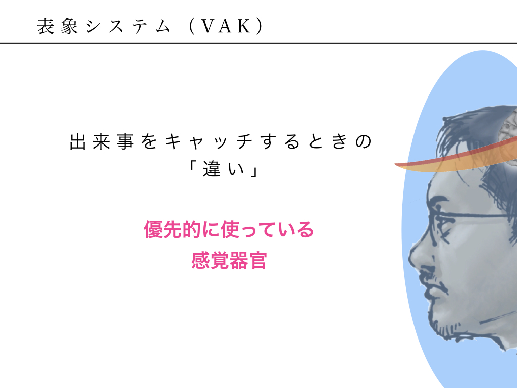 まず最初に理解していただきたいのは、表象システムとはVAKのうちどれかたった一つだけ使うということではありません。あくまでインプットの際にVAKのどれかが無意識に優位になり、それによって外界の情報の受け取り方のクセが出る、ということです。また、多くの人がVAKの3つのうち一つが優位になる傾向ですが、人によっては2つがほぼ同じくらいに優位になることもあり、さらに3つがほぼ同じくらいの優位性を持つ、ということもゼロではありません。それも合わせて理解しておいてください。