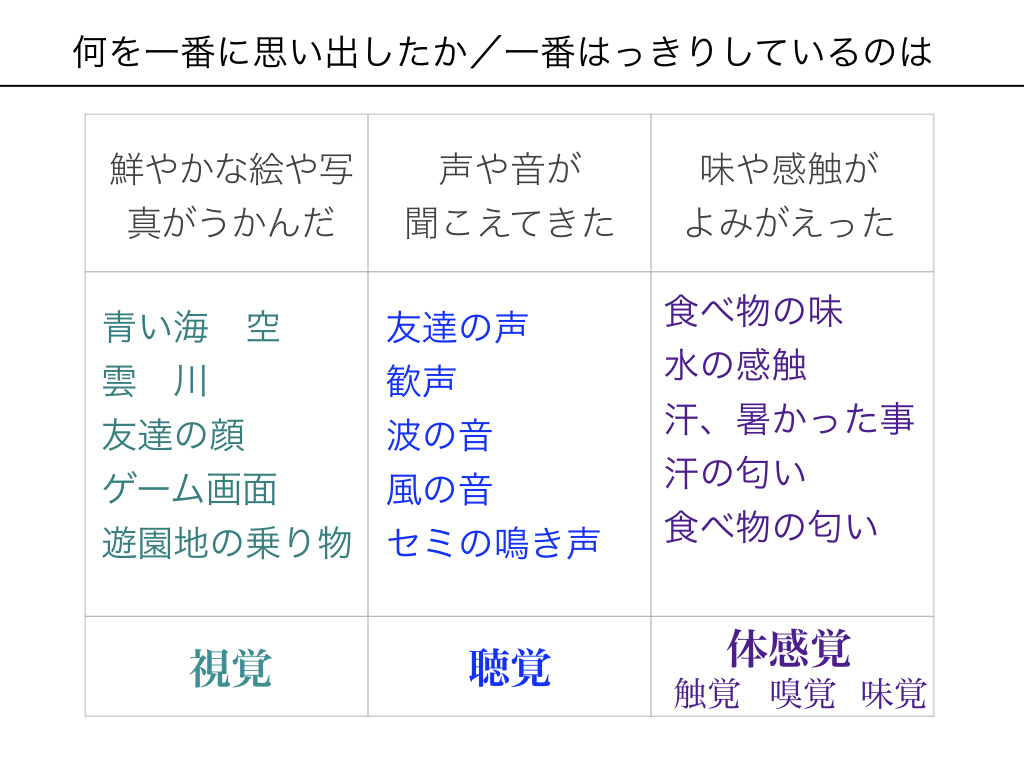 音や声がすべて遮断されました。そうすると今まで実感できていた夏休みの思い出が感じられなくなった、という方は、耳で聞いたもの、何かの音、誰かの声、言葉の記憶などを拠り所とする「聴覚(Auditory)」を一番優先して使っている可能性が高いです。