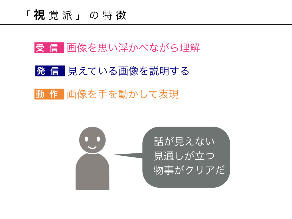 使う言葉の特徴は「見る」や「図、絵、イメージ」など見るものを入れた言葉が多いことです。「話が見えた」「まず全体図を見せて」「見通しを立てよう」「イメージできた」などの言い方を使う人はVが多いです。そして、実際に「見えない」と理解できない、納得できない、と感じるのがVです。