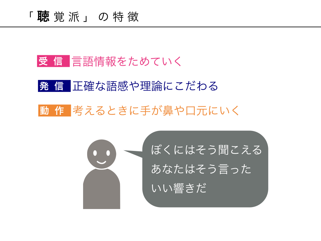 言葉や音を正確に掴んだり記憶に残したりしやすいタイプです。自分の頭の中にある事柄を説明しようとするときは、言葉をそのまま記憶から取り出せる感覚なので、他人からすると「記憶が正確」「細かいことまでよく覚えている」という印象を持たれやすい特徴があります。また本人も言葉の正確さにこだわる傾向があり、「あの時は『イメージ」ではなく「画像』と言ってましたよ」などと会話中に細かいことを指摘することもあります。