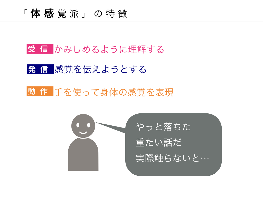 あれ?五感だからタイプは視覚/聴覚/触覚/嗅覚/味覚の5つでは?と気づくと思いますが、触覚・嗅覚・味覚はまとめて「体感覚」と呼ばれます。