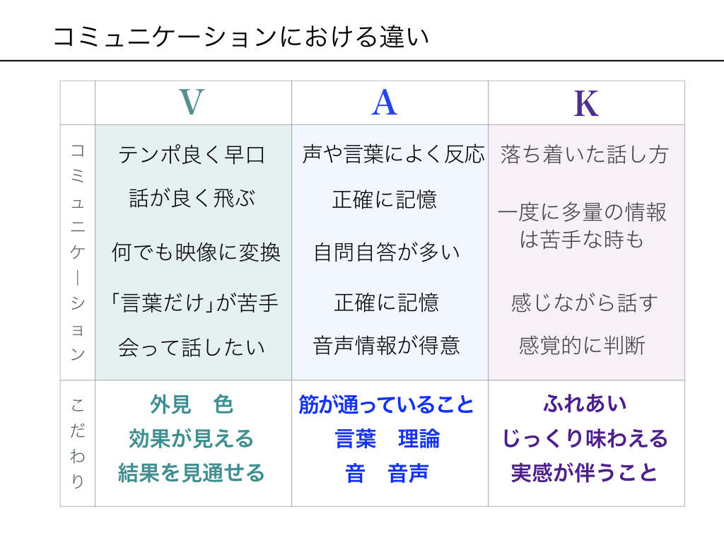 いかがですか? パーソナリティを知る手掛かりの一つ、VAK3つのタイプ、タイプの差がどんな風に出るのか、そして自分と違うタイプの人と接する時にはどんな工夫が必要か、などについてご説明しました。タイプの見分け方も含めて、理解していただけたでしょうか。