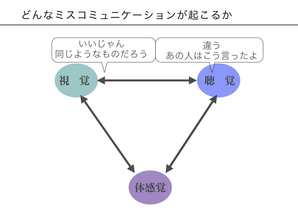 しかし、逆に相手のタイプに何ら配慮がなく「こちらが普通で相手は変だ」と感じたままであればミスコミュニケーションが起こりやすく、実際それは方々で起こっていることだと言えます。ミスコミュニケーションとは、相手に物事をうまく伝えられずに間違いや誤解を生んだり、伝達が価値観の違いなどから対立感情に阻まれることです。