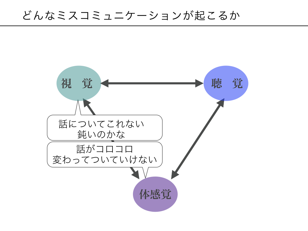 特に、ひとつひとつの事柄に対してしっかりと実感を持ってから、その感覚と共に頭の中に取り込もうとするKにとっては、Vの話し方は「話が変わりすぎてついていけない」と感じることがしばしばです。「え、ちょっと待って。さっきは○○について話していたよね?」と、話の流れを何度も確認しようとします。 しかし、Vからすると「さっきの話と関連しているのに、どうしてわからないのかな。少し頭の回転が鈍いのかも?」と面倒に思うことがあるのです。