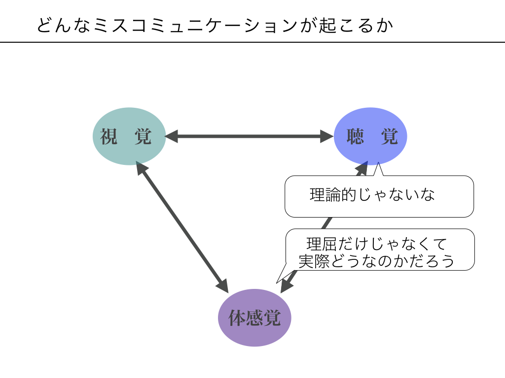 聴覚派Aは「聞こえ方」にこだわることから、理論を重視します。企画や計画などについても理論的にまとまっているか、データとの整合性は、というとことが非常に気になります。しかし「実感」重視である体感覚派Kからすると、そういったものはあまり意味をなさないものに思われます。そのため「そんな机上の空論よりも、まず現場だ」「とにかく行ってみよう、やってみよう」という方向に主張しがちです。