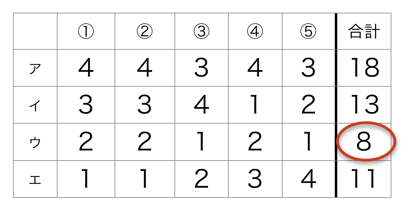 アイウエ各欄の数字を合計して、「合計」欄に記入してください