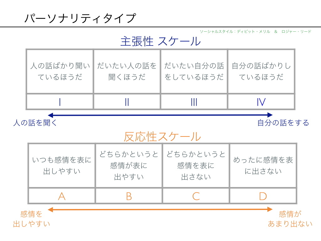 スケール法は人の中にある「Assertiveness」=主張性と「Responsiveness」=反応性が、どのように組み合わされているかで、その人のタイプを判別する方法です。