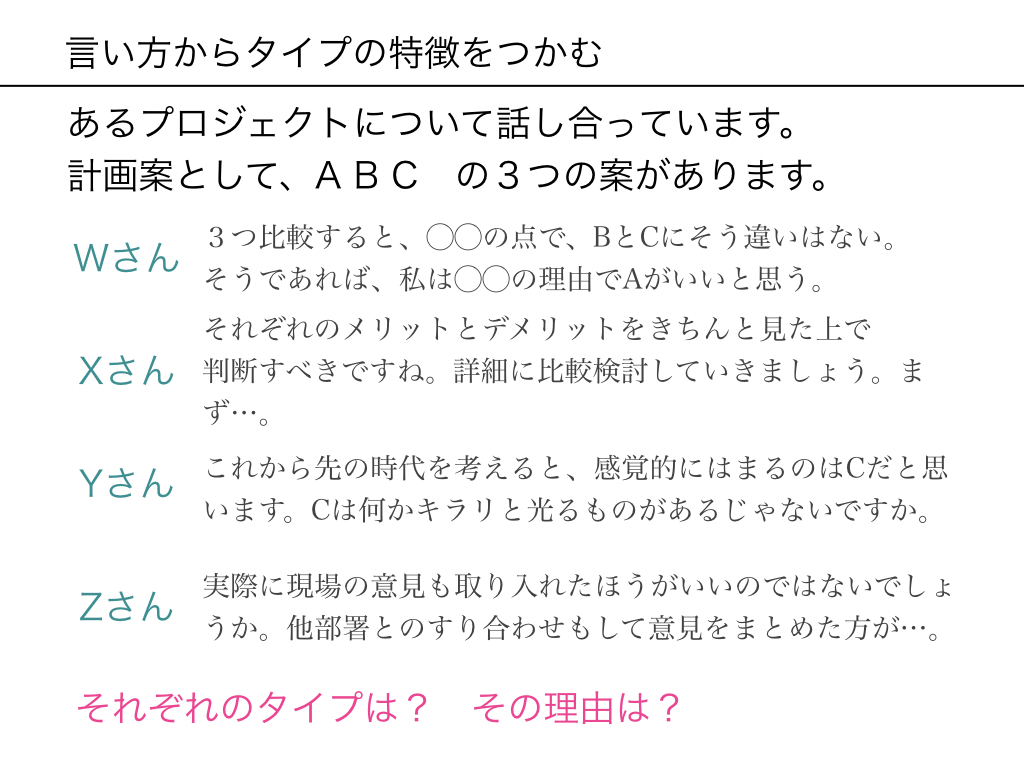 ここで発言したWさん、Xさん、Yさん、Zさん、それぞれ「アナリティカル」「ドライバー」「アミアブル」「エクスプレッシブ」とタイプがバラバラです。 どの人がどのタイプでしょうか? その理由も考えてください。