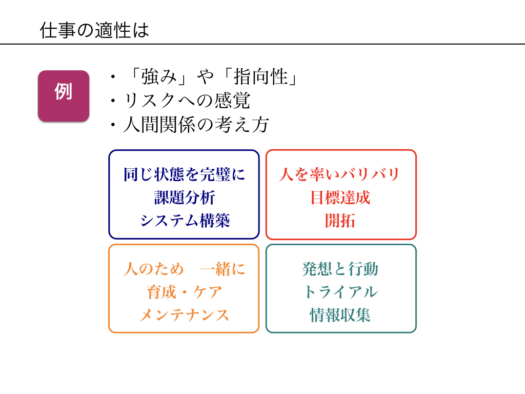 もし仕事を与えるとしたら、アナリティカル、ドライバー、アミアブル、エクスプレッシブの各タイプにはそれぞれどんな内容の仕事に向いていると思いますか?