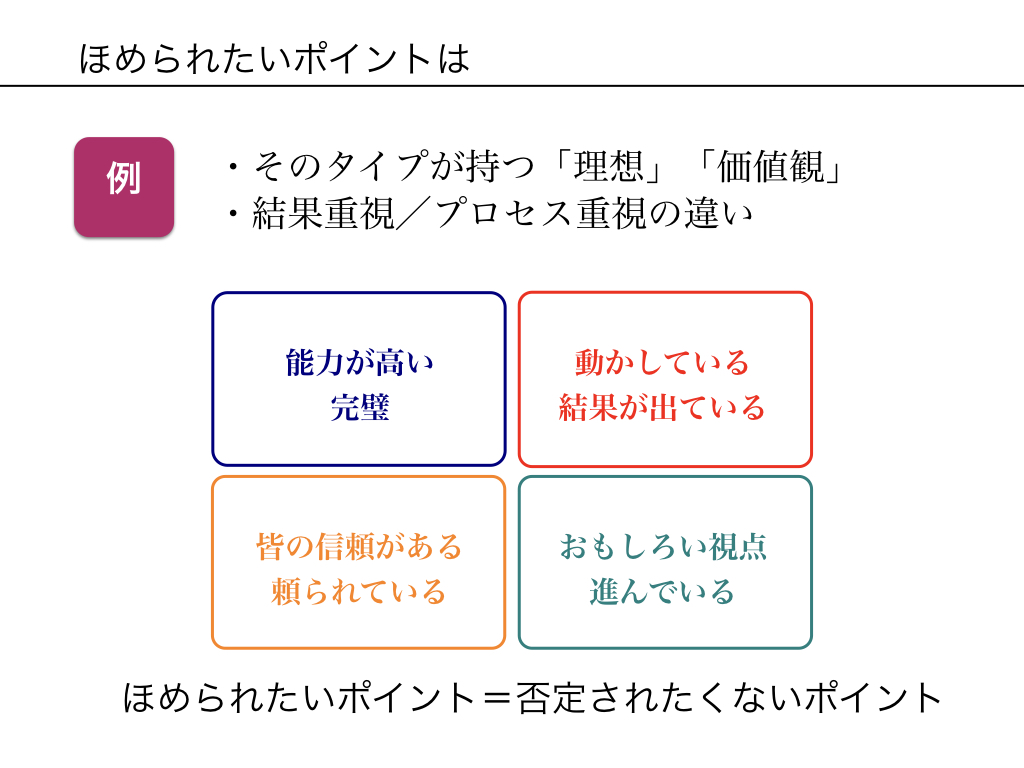 「褒めること」は重要なコミュニケーションスキルと前にお伝えしましたが、それぞれのタイプが評価されると喜ぶポイントはどんなところだと思いますか?