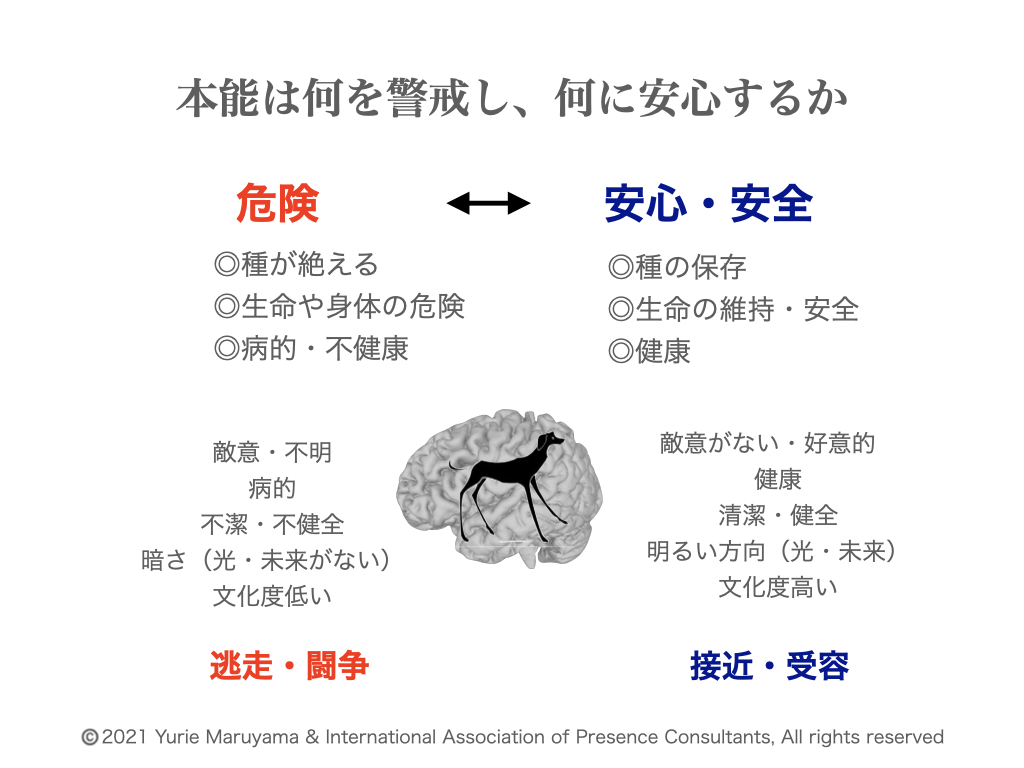 人間も一個の生物として、他の生物と同様に自分の安全、生命、種の保存を使命としてDNAに刷り込まれています。そのため、本能的に周囲を監視し、自分の存在にとっての危険性を警戒しています。なお、これは私たちが通常知覚できる意識ではなく、無意識(潜在意識)の領域においての話です。