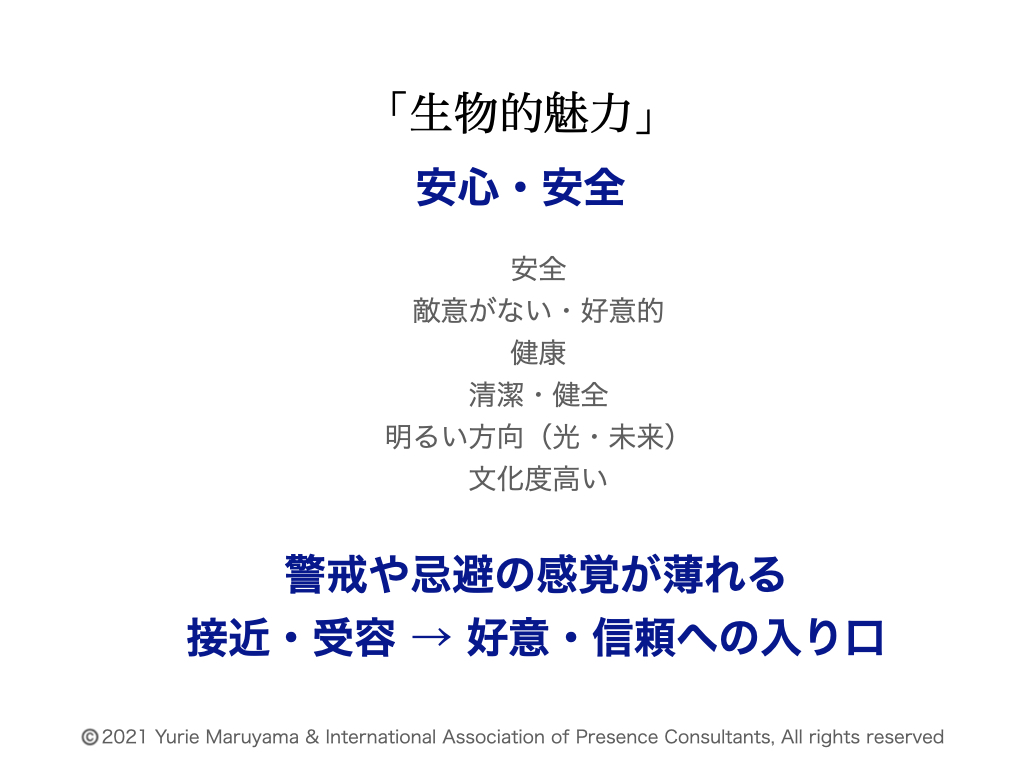 生物として、同じ生物の人間に対して魅力をアピールできるのは、これらの要素です。 私たちは自分の姿勢、表情、視線、動作、声・話し方をまず見直す必要があります。そして、肌や髪のツヤなど光沢を帯びることも魅力として有利です。肌や髪のツヤは生き物として一般的に健康な状態を表すからです。