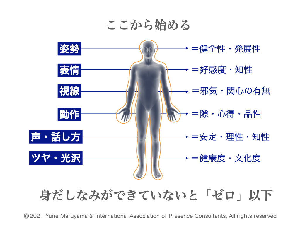 ここで説明する要素が「卓越した存在感」「人間として人を惹きつける魅力」のポイント、また「印象コントロールの原点」です。ここからしっかり磨いていきましょう。