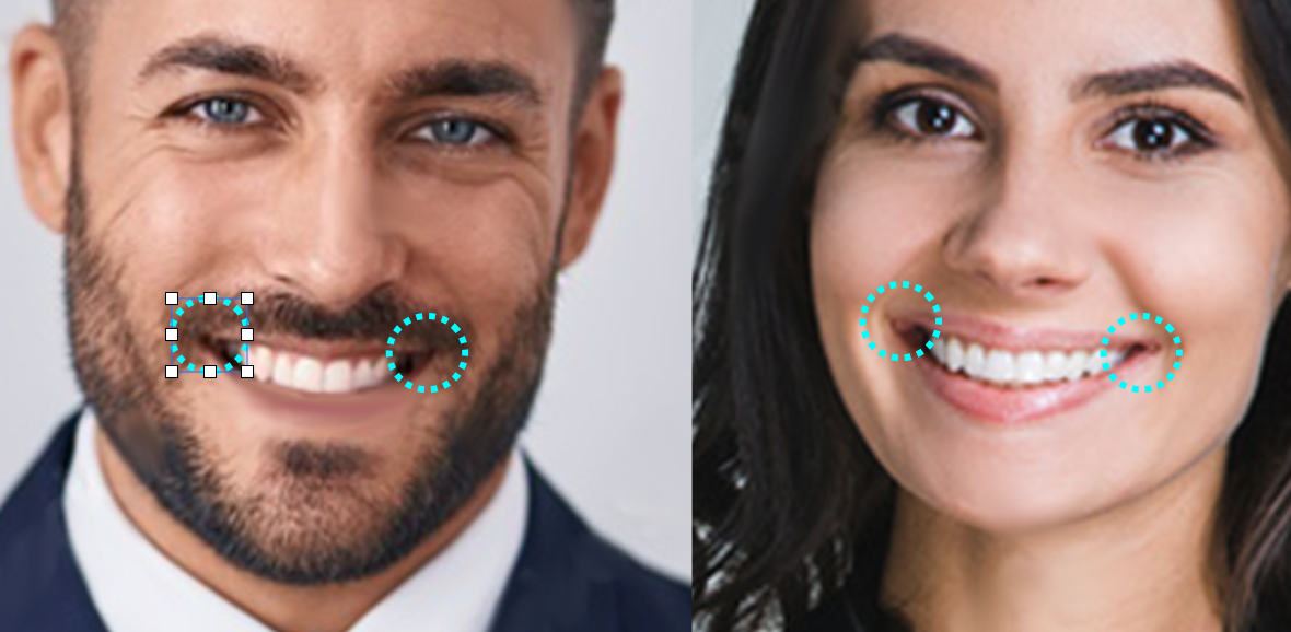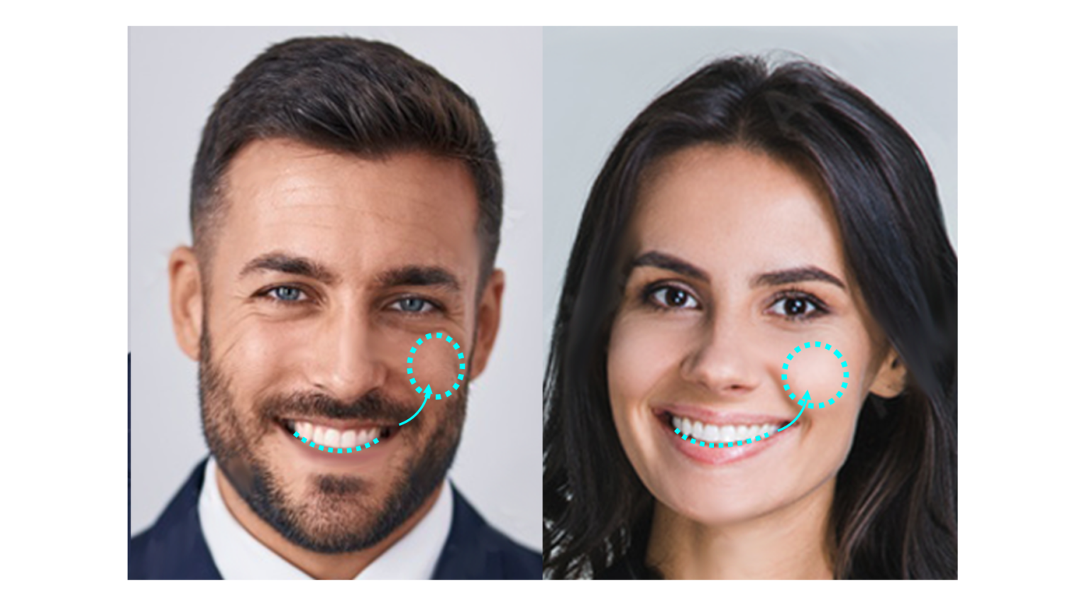 口角は両方同じ高さに上がっていることも大事です。どちらかのほうが高いと「片頬笑い(ニヤリ笑い)」となり、あまり印象の良くない表情となります。
