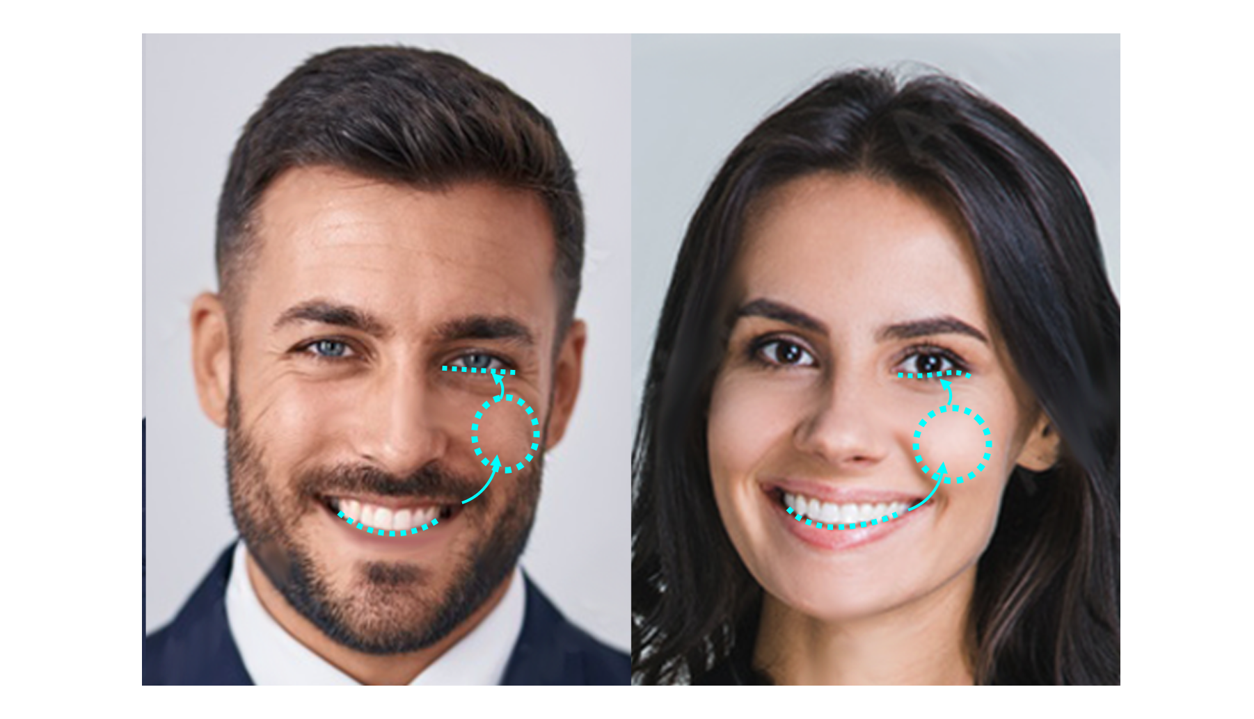 自然に笑うと、口角が上がり、頬を押し上げ、押し上げられた頬が下まぶたを引き上げます。そうすると、目を少し細めた状態になります。ですから、自然な笑顔では、目は虹彩の一部が上まぶたと下まぶたで隠れ、目尻が下がり気味になり、多少シワがあるのが特徴になります。しかし、自然に笑えていないと、目が緊張で見開かれたようになることがあり、虹彩もはっきり見えて目尻にシワも感じられません。