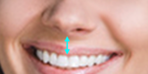 口角を上げると自然に鼻の下の部分が縮まるのですが、緊張してこわばるといると、その部分が不自然に伸びていることがあります。その状態であると、口角が上がっていたとしても魅力的に見えません。また、上唇が不自然に前歯を隠してしまい、下の歯が余分に見えることもあり、きれいなスマイルラインが作れません。