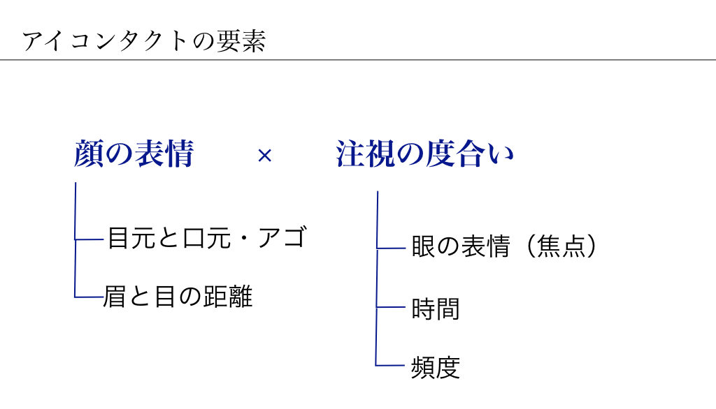 適切なアイコンタクトは表現力のひとつです。また、品や格にもアイコンタクトが重要です。適切なアイコンタクトを考えるために、アイコンタクトのポイントを細分化してみます。