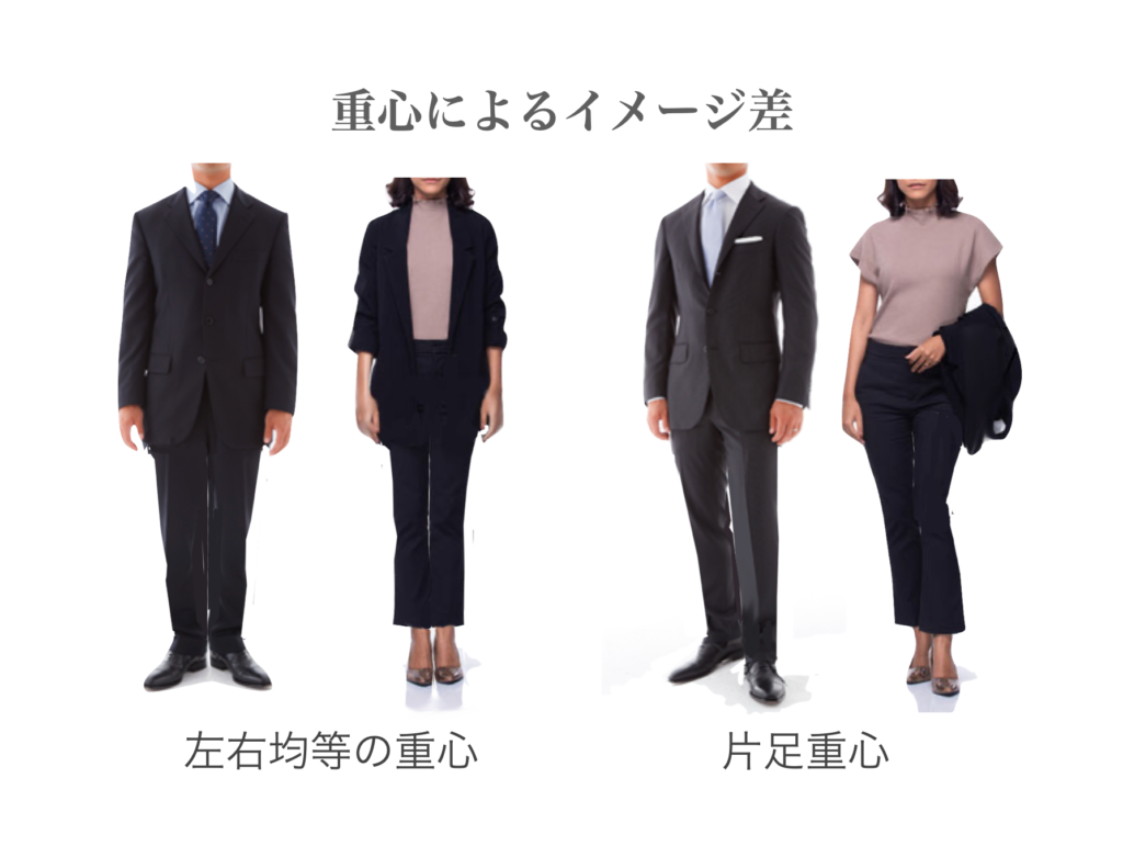 「片足重心」とは、重心を片足にかけて、もう一方の足を少し引く立ち方なので、アンバランスで洗練されたイメージになります。全体が逆三角形のようなシルエットとなり、全身がスッキリ見えます。モデルなど見られる仕事の人が人前に出たり、写真を撮られたりするときは、必ずこのような立ち方になっています。自分をかっこよく見せることを知っているのですね。