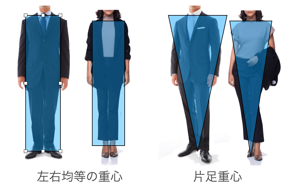 「ポーズ」として考えた場合、バランスが均等な状態より、アンバランスな状態のほうが、実は「かっこいい」のです。ですから、両足に重心を均等にかけた立ち方は、安定感があっても、「洗練」「かっこよさ」のイメージにはなりにくいのです。