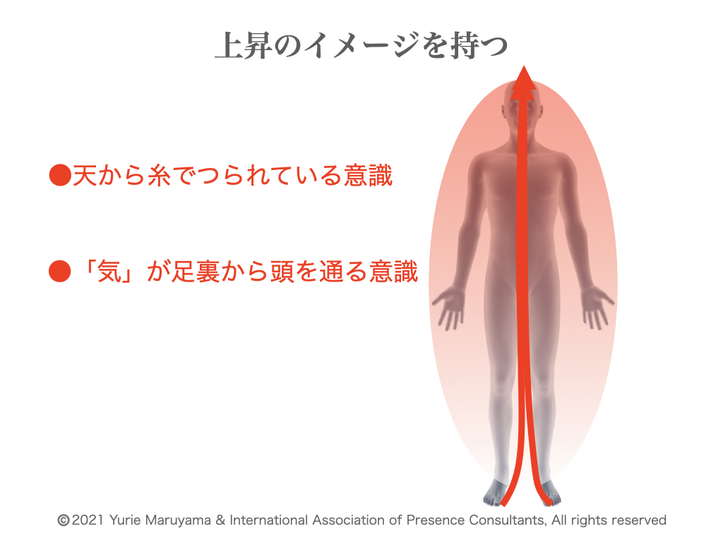 毎日、生活する中では疲れが出て、身体が重くなり重心が下に下がってくることが誰にでもあります。その状態は側から見るとどこかエネルギーがなくキレがなく鈍い人のイメージです。そんなときこそ「頭の真ん中に糸がつけられ、天から引っ張られるつもりで立つと良い」ということを思い出してください。