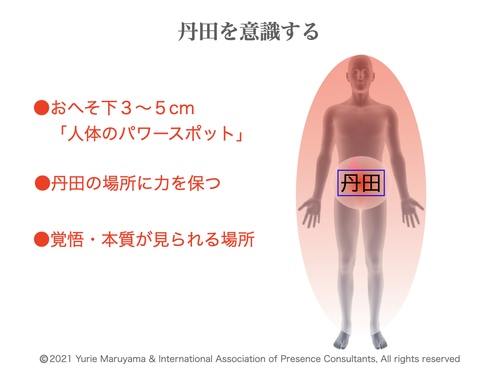 お腹の力、というときに忘れてはいけないのは「丹田」です。「丹田」とは、おへその下3cm〜5cmくらいにあるとされる、人体のエネルギーが集まる場所で「人体のパワースポット」と言われます。西洋医学的では存在は実証されておらず、あくまで精神的なものという扱いですが、東洋医学では重視されます。