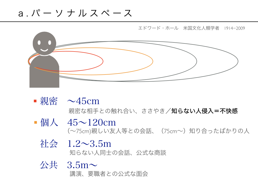 (なお、公共の場では3.5m以上の距離が必要です。つまり、講演などで人を呼ぶ場合は聴講者と講演者の距離は3.5m以上離さないと、講演中お互いが居心地よく話の内容に集中できない可能性があります。これも知っておきたいですね。)