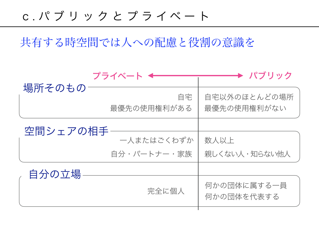 パブリックか。プライベートか、という判断の要素は「場所そのもの」「空間シェアの相手」「自分の立場」で捉えるとわかりやすいでしょう。