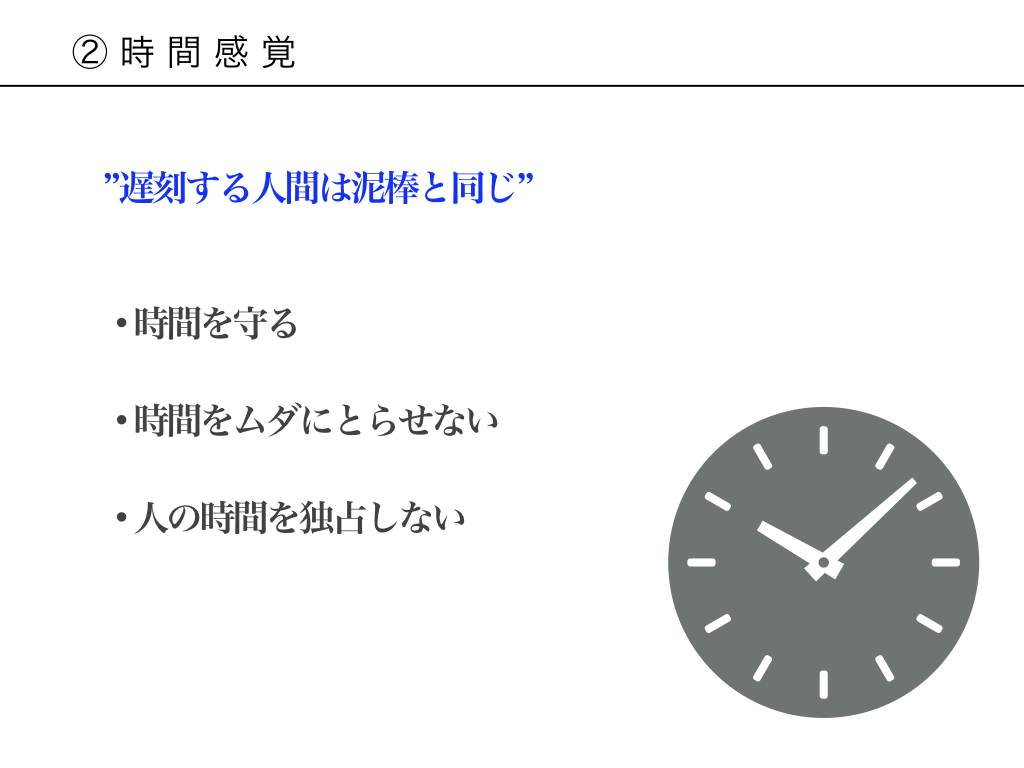 正しい時間感覚は、社会人としての知性を測るバロメーターです。上に立つ立場、人をリードする立場であれば、「時間は万人にとって貴重なもの」「相手の時間についての配慮がなければ、相手の時間を奪う『泥棒行為』に等しい」ということに十分な認識が必要です。特に時間感覚がしっかりしている人は、下記のように「相手の時間に対する心づかい」が感じられる行動をします。