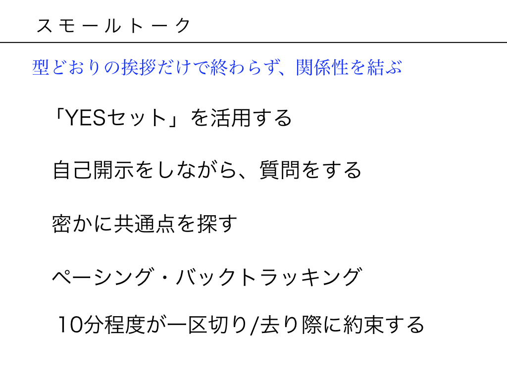 以上、パーティなどの不特定多数がいる場所で見知らぬ相手とのスモールトークをスムーズに進めるための便利な手法をご紹介しました。商談で初めて会った相手にも応用しやすい手法です。心理学やコミュニケーションの回でお伝えした内容も合わせて、試してみてください。