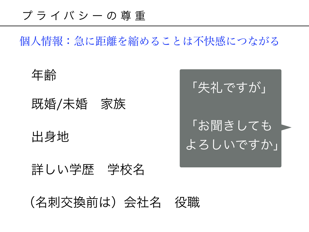 相手を知り、うまくコミュニケーションしたいと思っても、初対面の相手や、あまり親しくない相手の場合、相手のプライバシー(個人情報、中でも特に私的なもの)に関わる話題には細心の注意が必要です。