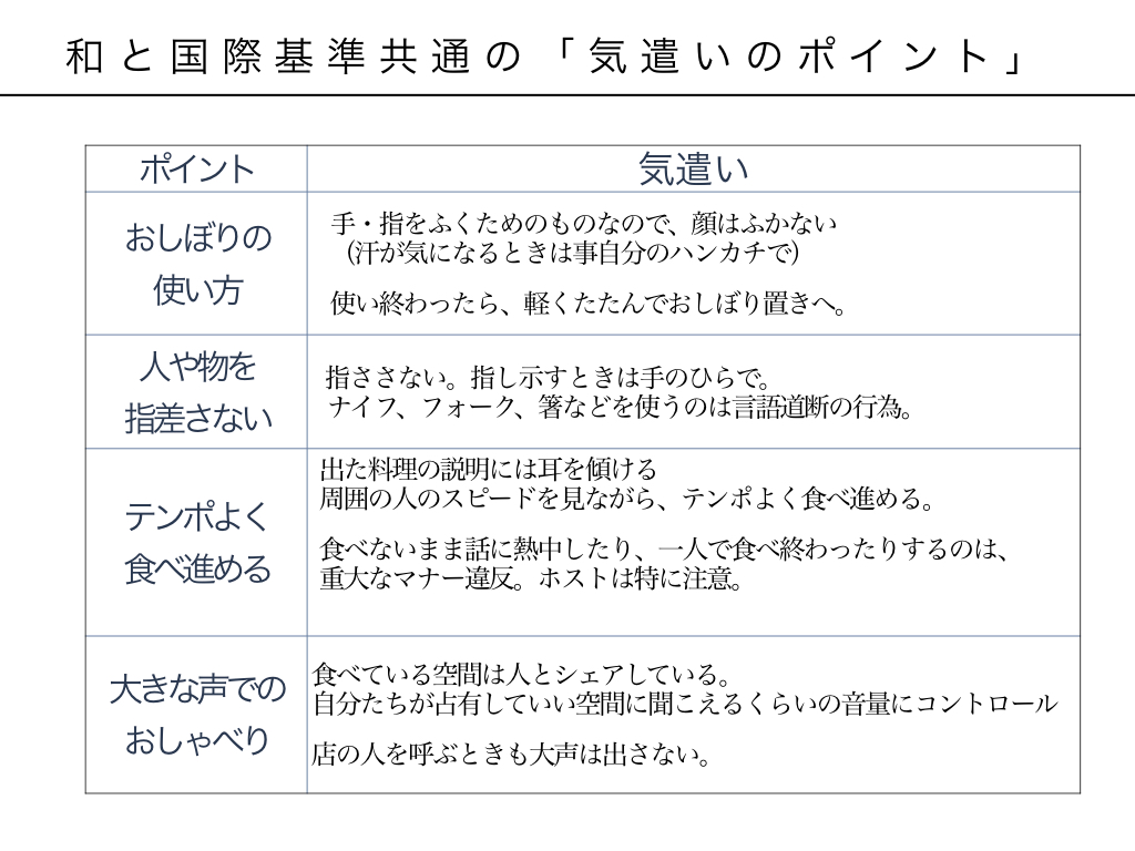 国際標準と和はすべて違うわけではなく、気遣いのポイントが似ているところもあります。そのポイントをいくつか併せて確認しておいてください。