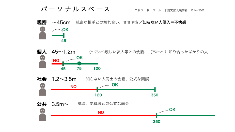 「パーソナルスペース」とは人間が本能的に「侵されたくない距離」です。侵されると不快を感じ、警戒心が刺激される距離です。研究家としてはエドワード・ホールという文化人類学者が有名です。