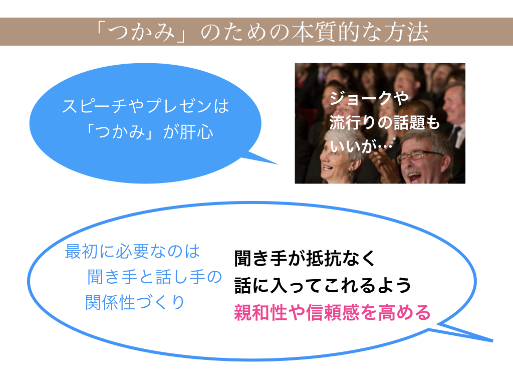 スピーチやプレゼンは「つかみ」が肝心、と言います。「つかみ」とは、聞き手の関心を惹くことです。そのために、最初にジョークを言って笑わせたり、流行りの話題で乗ってきてもらう、など、話し手になる人はいろいろな工夫をしています。