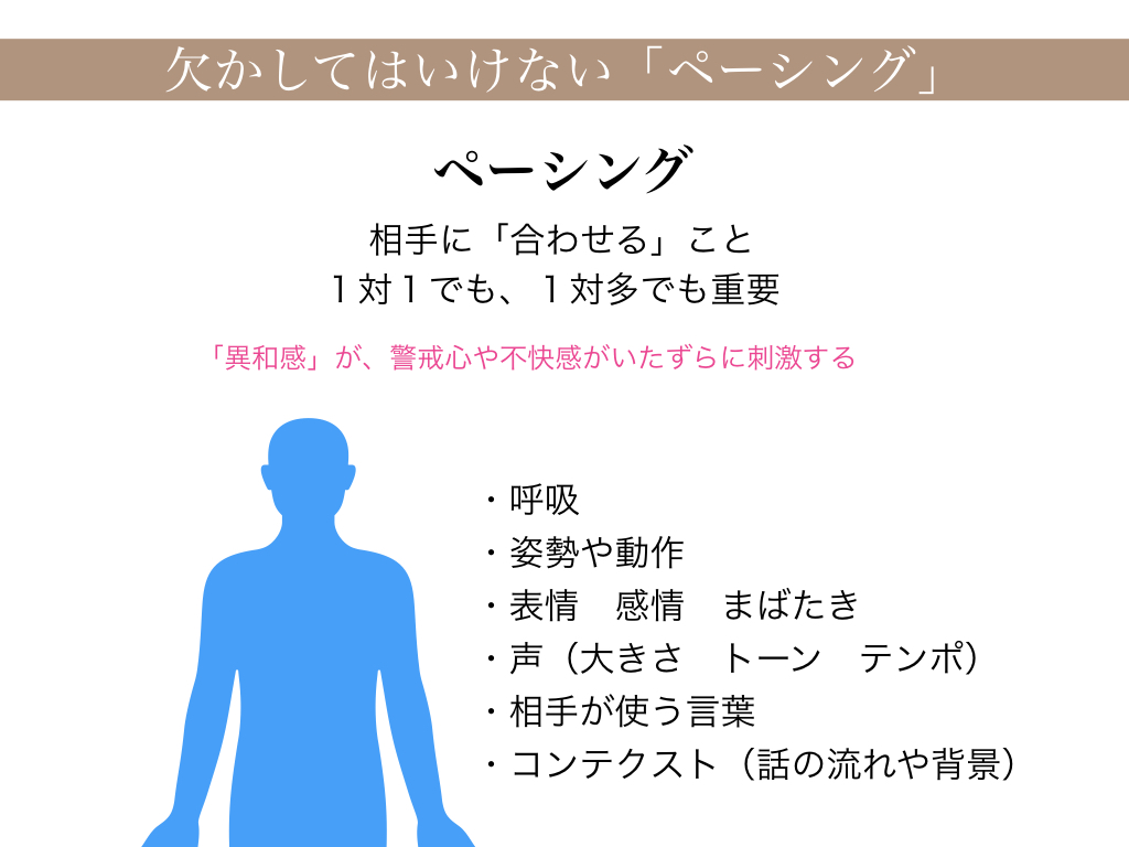 どんな方法で最初のラポールを築くのであっても、非常に重要なテクニックがあります。それは「ペーシング」です。ペーシングとは相手に「合わせる」ことです。コミュニケーションにおいては、1対1でも、1対多でも、相手のペースに合わせられないと、「ラポール」は形成されにくくなります。それは、相手が感じる「異和感」が、警戒心や不快感をいたずらに刺激するからです。