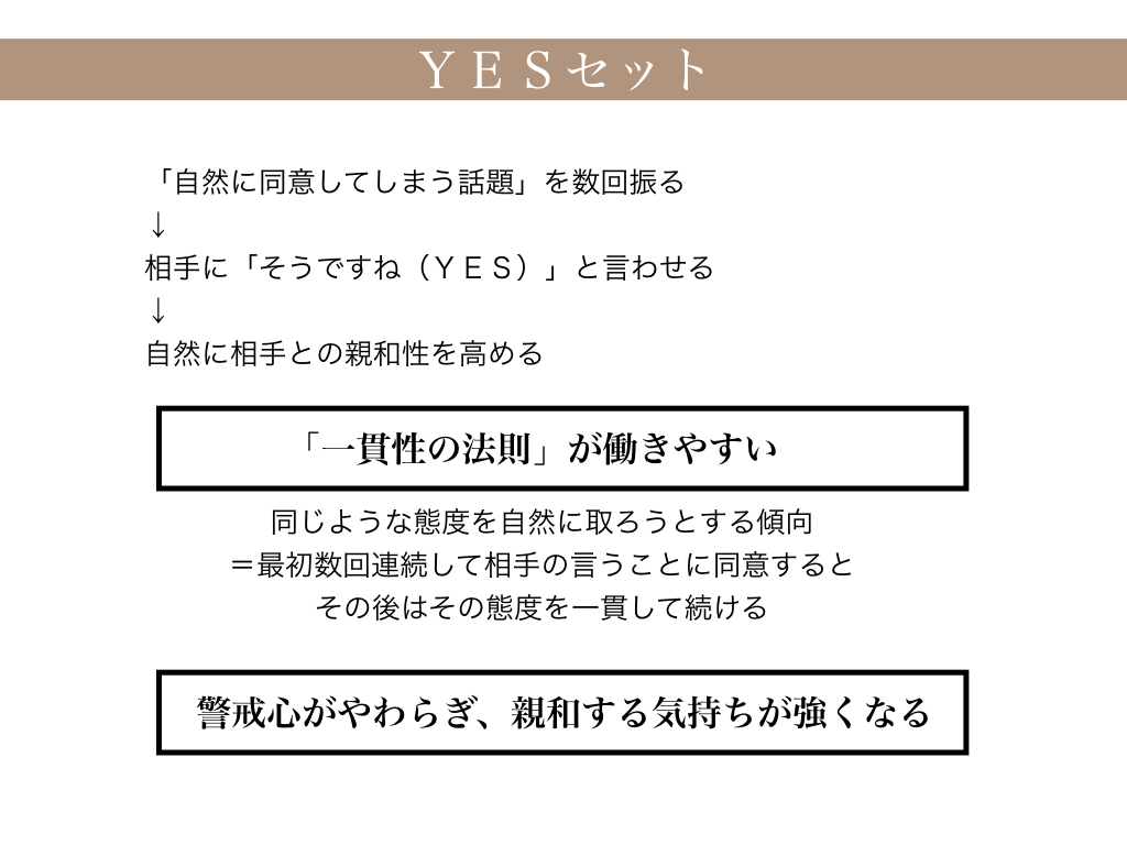 「YESセット」とは、最初「自然に同意してしまう話題」を数回相手に振り、相手に「そうですね(YES)」と言わせることで、自然に相手との親和性を高める、という話法です。初対面の人などと打ち解けたいと思うときに使うと一定の効果があります。社交マナーなどでも教わる方法です。