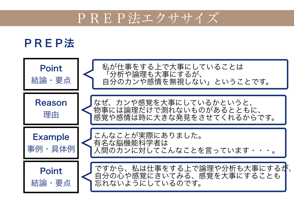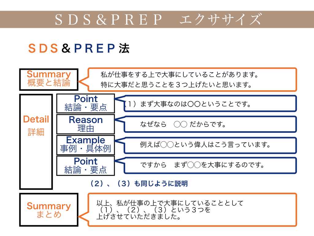 今回は「理路整然とした話し方」を培う、3つのエクササイズ「SDS エクササイズ」「PREP エクササイズ」 「SDS & PREP エクササイズ」という方法をご説明しました。