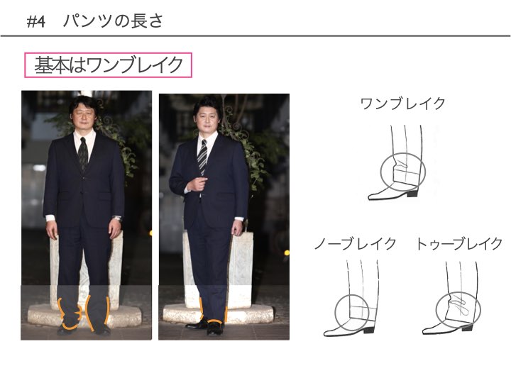 細身のパンツであれば、やや短めの「ハーフブレイク(足元にワンブレイクより小さなくぼみ)」か「ノーブレイク(くぼみなし)」。太目のパンツであれば丈もたっぷりとって「トゥーブレイク(2ブレイク、つまり二つくらいくぼみが出るくらいの丈)」をベースに考えるとよいでしょう。