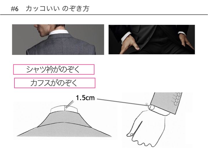 スーツの首の後ろからのぞくシャツの高さ、スーツの袖口からのぞくシャツの袖の幅は、それぞれ1.5cmが目安です。