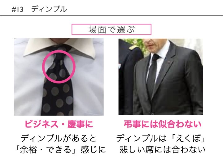 また、謝罪時などには相手に与えるイメージを考え、ディンプルは作らないほうが無難です。ディンプルは装飾性が高く「しゃれている」感じが強いものです。ですから、本来は誠心誠意謝ろうとする必死な心情のはずであるのに、「おしゃれを考えているような余裕があるんだ」という印象を与えるかもしれません。そのような想像力が働かないと、謝罪だけでなくビジネスも失敗します。
