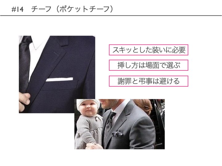 なお、ポケットチーフの挿し方にもTPOがあります。下記を参考にしてください。